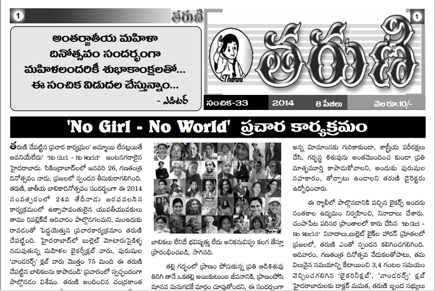 Tharuni initiated 'No Girl-No World' Campaign from International Women's Day 2014.Prenatal Diagnostic Tests are paving a way to abort the girl child. This News Letter highlights what we will lose without Women in this World.